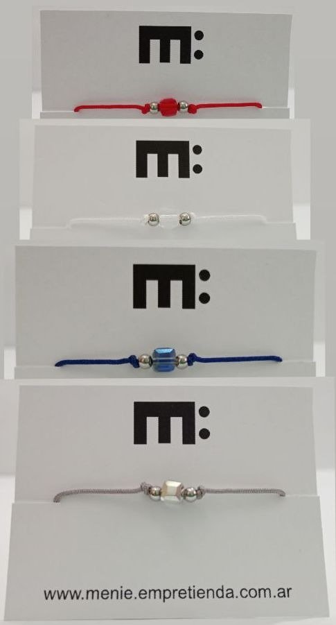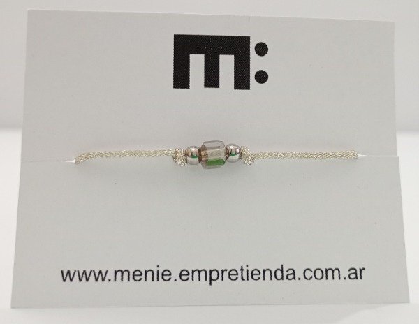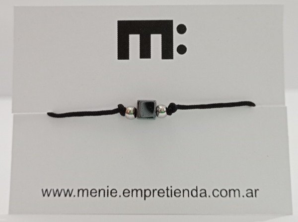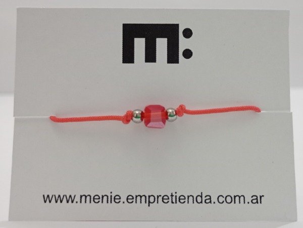 Pulsera regulable en hilo chino con cristal cubo y cuentas de acero quirúrgico.